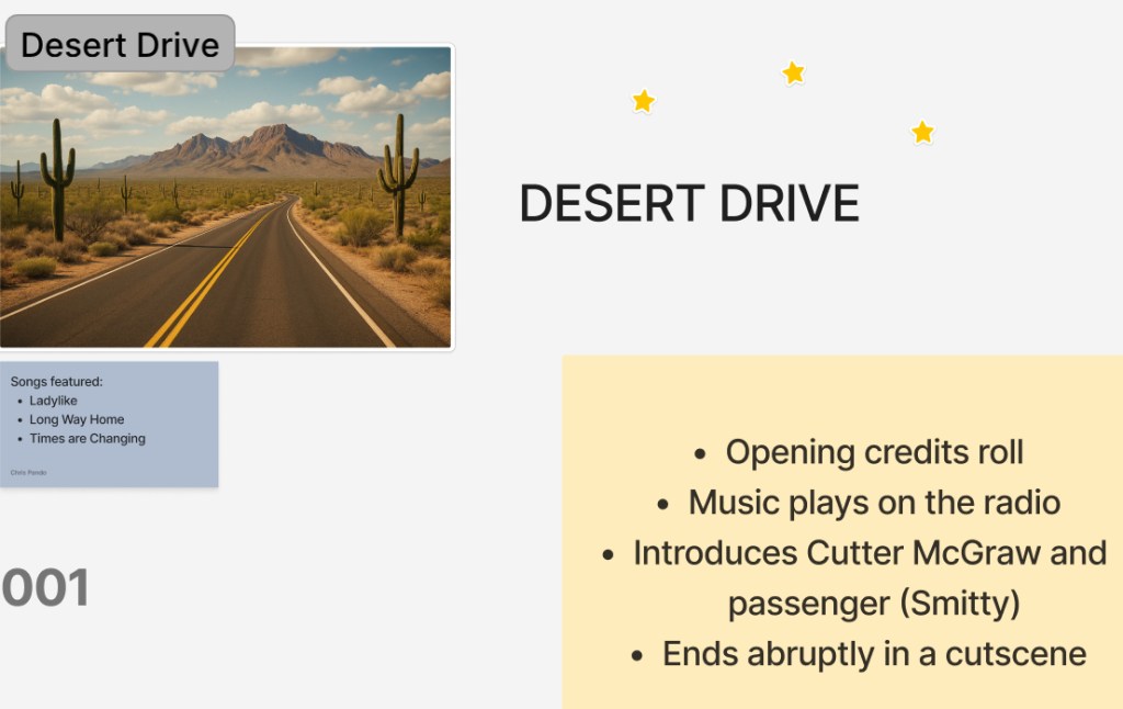 It might be another week or so before the game story script is sent over to the voice actors, but I can already say it reads like an action movie. Using Figma to storyboard the game has been a blast; here’s a peek at the first slide: