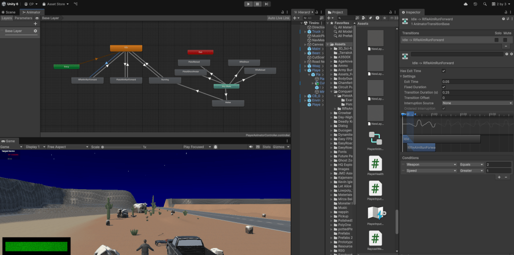 This week, Chris has been working on the animation flow in Unity’s Animator window. It’s been really interesting watching the different animation states-Idle, Pistol Aim, Run-come to life while playing inside the game.